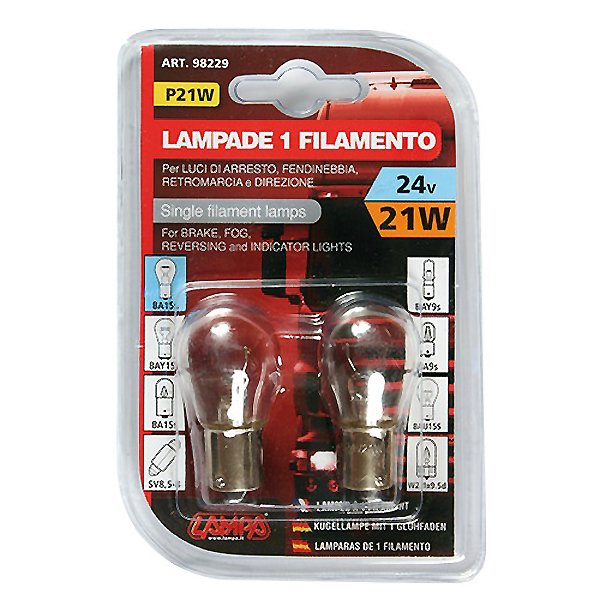 Mονοπολική λάμπα 24V P21W – 21W – BA15s – Συσκευασία 10 τεμαχίων. Για φώτα φρένων, φλας, όπισθεν και πίσω φως ομίχλης. Διαστάσεις 52,5×26.5mm.